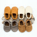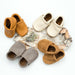 Starry knight design shoes are handmade in Montana USA by a team of local women with high-quality 100% leather and suede. Since 2008, we have been designing and making soft soled leather shoes for your tiny babies up to kids. Our shoes are great for ages newborn to 4years. Soft and non restrictive for developing feet. Soft elastic band around the ankle. Help keep socks on newborns. Great for babies crawling around.